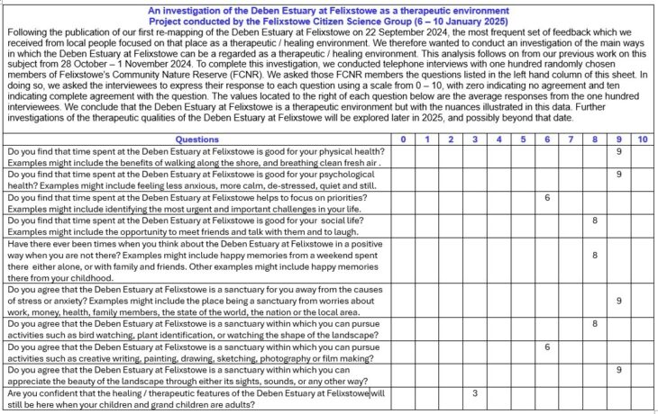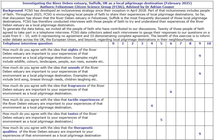 A combination of ethnographic interviews and telephone interviews has been employed by FCSG throughout their research (Cooper 2025). The benefit of doing so has been to try and achieve a depth and breadth of understanding. Interviewees for both methods have been randomly selected from the 1,700 membership of Felixstowe’s Community Nature Reserve. Ethnographic interview groups have never exceeded twelve members. Those ethnographic interviews are conducted during guided walks which have taken place, at least once a month, since the start of 2025. Telephone interviewees have averaged one hundred randomly chosen individuals. Regarding those telephone interviews, 25 members of FCSG volunteer to each contact four nominated interviewees – the contact details for whom are allocated to them by FCSG leaders. In that way, a sample of 100 telephone interview responses are quite easy to organise within no more than five working days. The results of both forms of data collection are added to a shared document on One Drive cloud storage service.