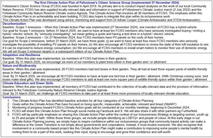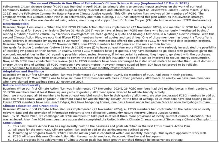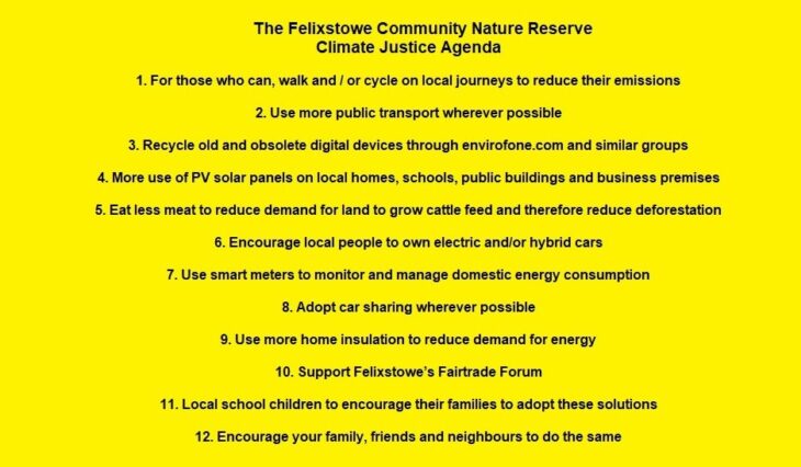 Community-based climate activism began in the Felixstowe area in September 2021 when questions were asked of Felixstowe’s Community Nature Reserve about their willingness to develop a climate justice agenda. Between that beginning and July 2022, a Climate Justice Agenda was developed using ideas suggested by local people in the Felixstowe area. This Climate Justice Agenda may be summarized as follows: