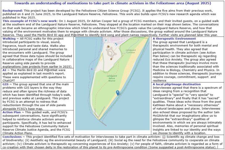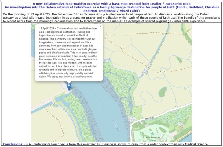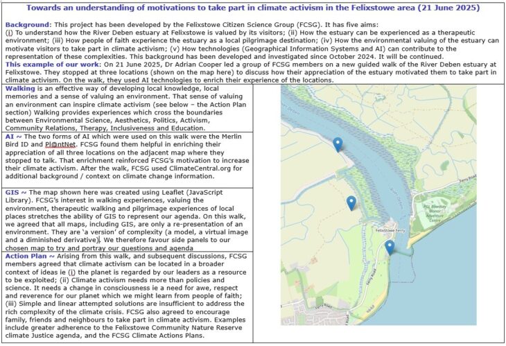 This project was developed by the Felixstowe Citizen Science Group (FCSG). They were founded in April 2018 with the principal aim of conducting impact analyses on their local community nature reserve. However, in addition to that core activity, FCSG has addressed a broad range of other citizen science projects. Their Facebook page shows that work. Throughout 2025, FCSG has become increasingly interested in climate activism and the ways it is inspired by greatly valued local environments. Most of the work this year has focused on the River Deben estuary and Landguard Nature Reserve in Felixstowe, UK. Both those environments have been appreciated by research interviewees as therapeutic environments. For local people of faith, they are also widely regarded as local pilgrimage destinations i.e. locations where those individuals can reflect, meditate and / or pray to their chosen deity.