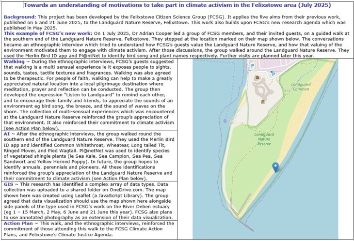 This research into motivations among people in the Felixstowe area to participate in community-based climate activism will continue into 2026 and beyond. The main difference between that future work and the research conducted in 2025 will be to locate the research in new locations to test whether the integrity of the five sets of motivation will remain in tact. Preliminary work at a location which is away from the River Deben estuary and the Landguard Nature Reserve took place in July 2025. It is summarised here: