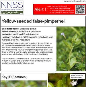 Yellow-seeded false pimpernel (Lindernia dubia) is new to Great Britain (GB) and was detected in Pulborough, West Sussex, earlier this year. This species is an annual plant of wetland habitats, that spreads along waterways with contaminated equipment and could potentially be spread by waterfowl. It is already invasive in parts of Europe and poses a risk to native species and habitats.