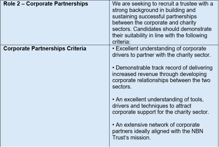 Role 2: Corporate Partnerships: Building and sustaining successful relationships between the corporate and charity sectors, leading to increased income generation and opportunities.